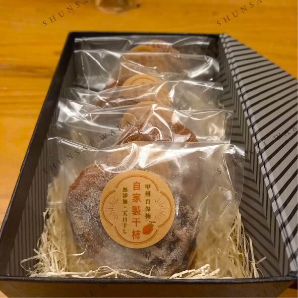 高級品とされる1つで350~500g程ある大きくてジューシーな山梨県産甲州百匁柿(こうしゅうひゃくめがき)を丹精込めて天日干しし、無添加で仕上げた自家製干柿